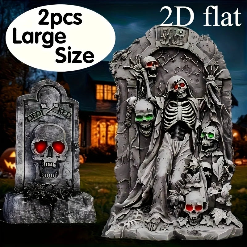 Halloween large outdoor decoration, 2 tombstones and courtyard signs, equipped with 8 plastic stakes, realistic skull tombstones